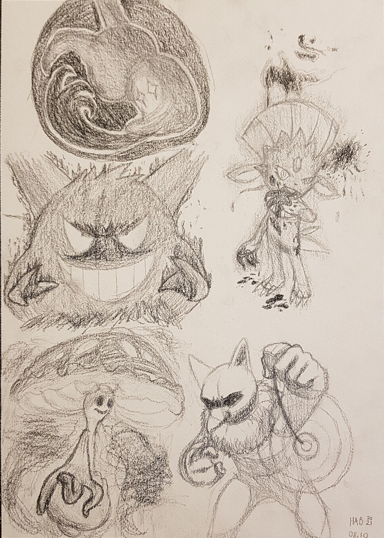 I drew this one on acid-free paper about two months ago, giving the drawing a grainy texture, and I mostly drew with coal pencils because I wanted to emphasise on shadows. I was especially satisfied with the black background and white outline around Mimikyu, some of the blood splatter around Weavile and the shading on Hypno.