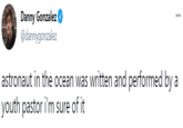 On May 4th, Twitter[11] user Danny Gonzalez posted, "astronaut in the ocean was written and performed by a youth pastor i’m sure of it," garnering over 15,000 likes and 300 retweets in three days (shown below). On the same day, music critic and YouTuber Anthony Fantano tweeted,[12] "How does an astronaut in the ocean feel?" garnering over 3,000 likes in the same span of time.