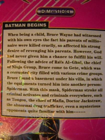 Batman is a DC comics superhero who fights crime in the fictional city of Gotham. His secret identity is Bruce Wayne, a play-boy billionaire who uses his money to finance gadgets, vehicles and other crime-fighting technology. Wayne's motivation for becoming Batman stems from witnessing his parent's murder at the hands of the criminal Joe Chill when he was eight years old. Batman regularly faces certain villains including the Joker, Two-Face, the Penguin, Bane, Poison Ivy, Killer Croc, Mr Freeze, Ra's al Ghul, the Scarecrow and the Riddler.[1]