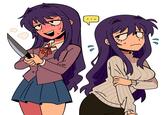 While @desperosolace posted her finished work on the 6th, edits of the character began appearing before then. For example, on November 3rd, Tumblr user aku-no-homu[16] uploaded an edit that gained over 3,200 notes (shown below, left). The finished image has been used in various photoshops, as well as receiving fan art of the image itself. For example, on December 11th, Redditor MrMutlu[17] uploaded an edit to the /r/DDLC subreddit that gained over 360 upvotes (shown below, right).