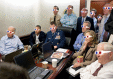 It shows President Barack Obama, Vice President Joe Biden, Secretary of State Hillary Clinton and members of the national security team gathered inside the White House Situation Room as they receive updates on the mission against bin Laden. Today -- barely two days after the photo was shared -- the image is almost the most viewed item on Flickr.[13]