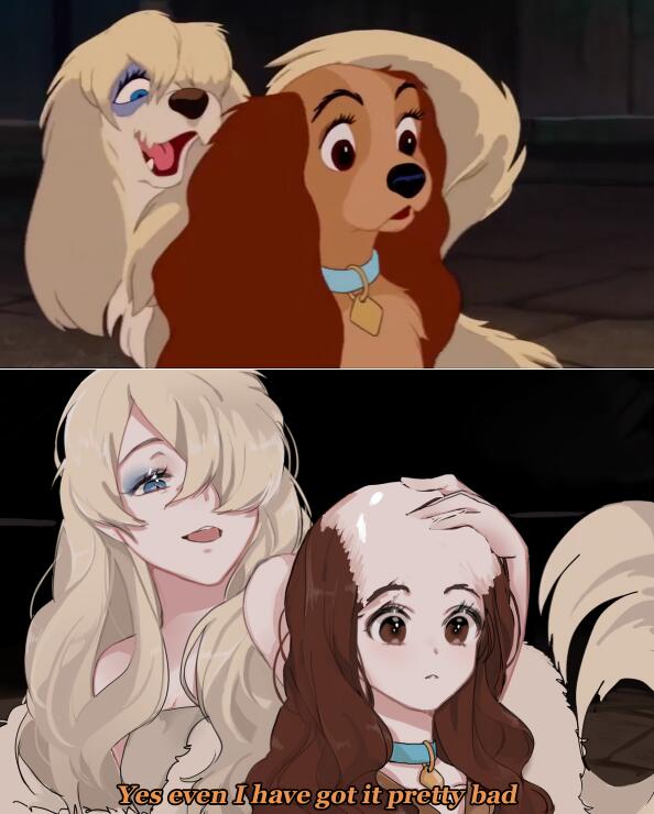 On October 14th, 2018, Korean Twitter user @pixxcc[1] posted a cel from Lady and the Tramp featuring the characters Lady and Peg redrawn as gijinka characters. The tweet gained over 48,000 retweets and 125,000 likes (shown below).